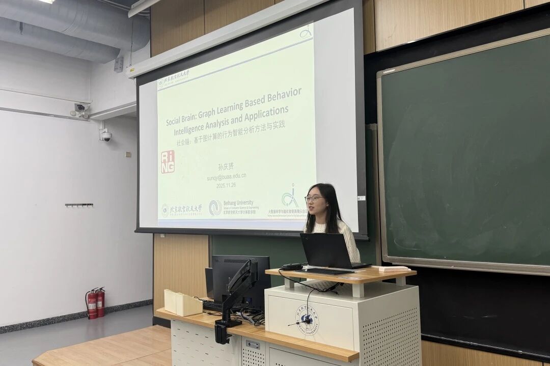 随后,孙庆赟老师作题为《社会脑:基于图计算的行为智能分析方法与实践》的报告。孙庆赟老师从科学研究第四范式——数据出发,阐述了大数据的重要性与其核心特点,并提纲挈领地指出大数据发展的两大趋势:从大数据迈向普适智能,以及从信息链接深化至行为认知。在此背景下,孙老师从应用、原理、未来方向三方面,详细介绍了其团队的核心研究成果“行为大数据的智能计算系统”。